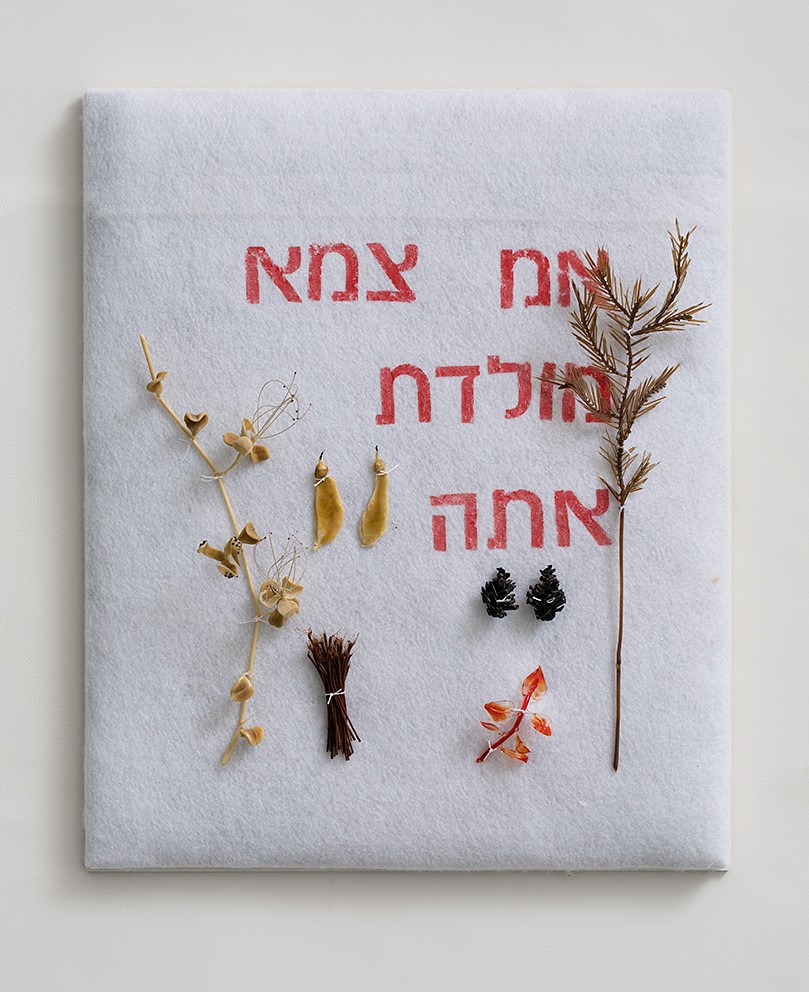 Flame-worked glass and printed text on felt