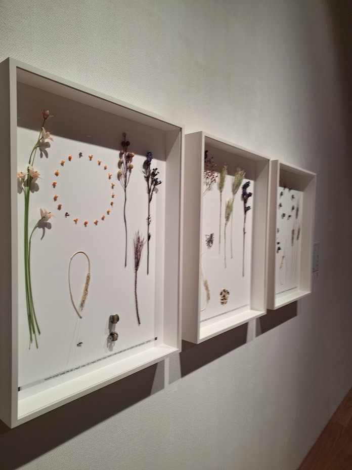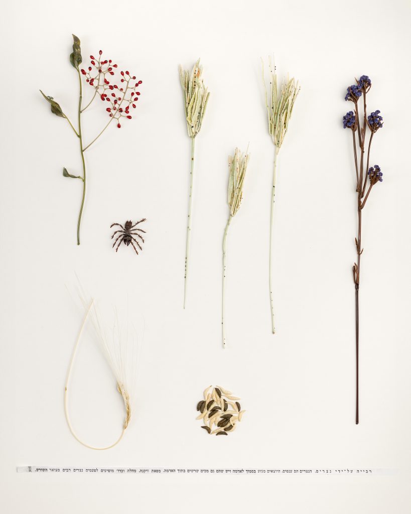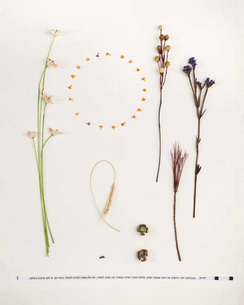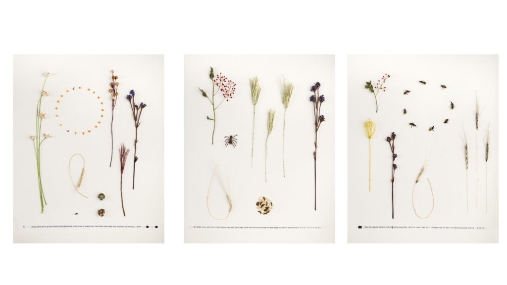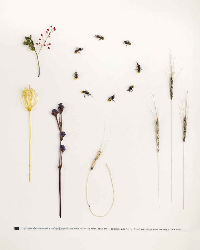 Assembly, 2023, flame worked glass, cut and menipulated paper, size 70-50 cm A triptych, consists of meticulous workmanship of plants and insects' origin of Israel, made of glass. Based on a visual lexicon the artist developed, each part of the work reveals a complete visual and iconographic world. each section of the triptych is a sculpture array of fauna and flora accompanied by7text describing agriculture processes, from the book "Plants in Israel", 1956, presented to us in a subtly way, reviling the complex and sensitive reality the artists is part of.