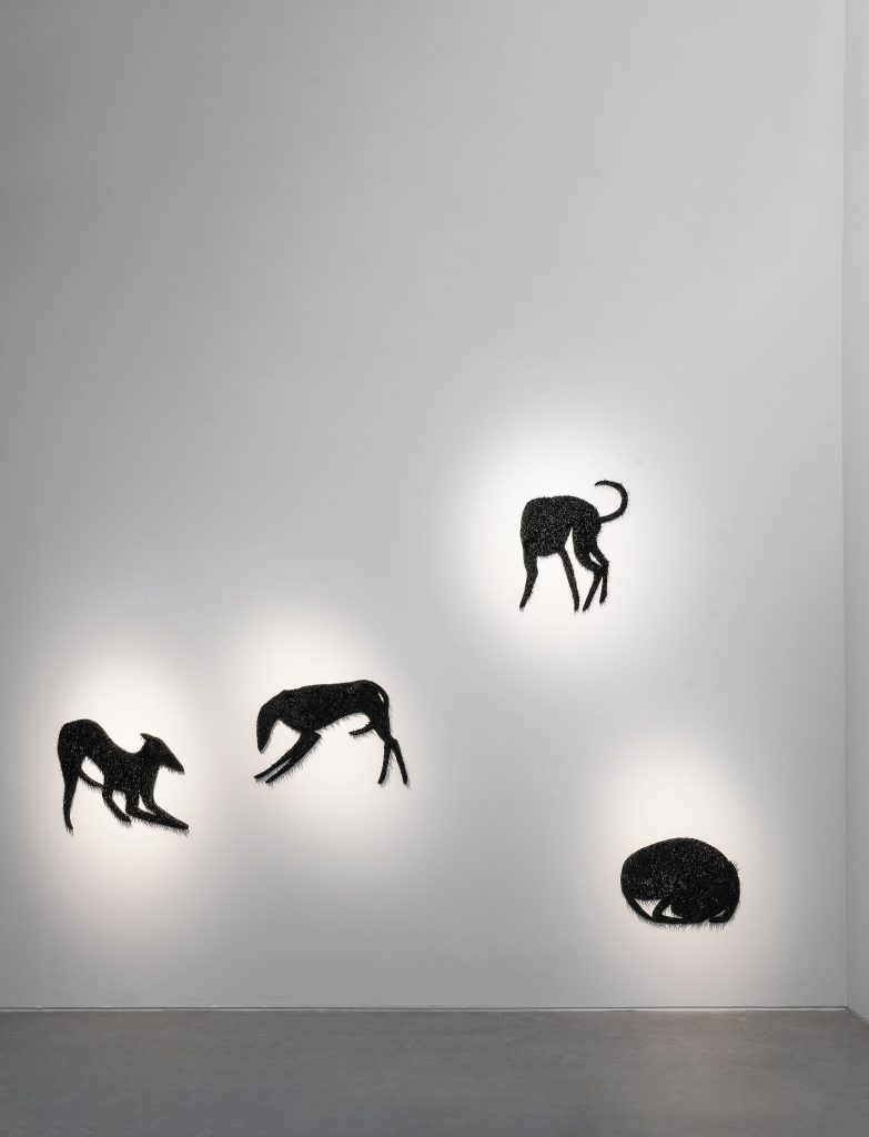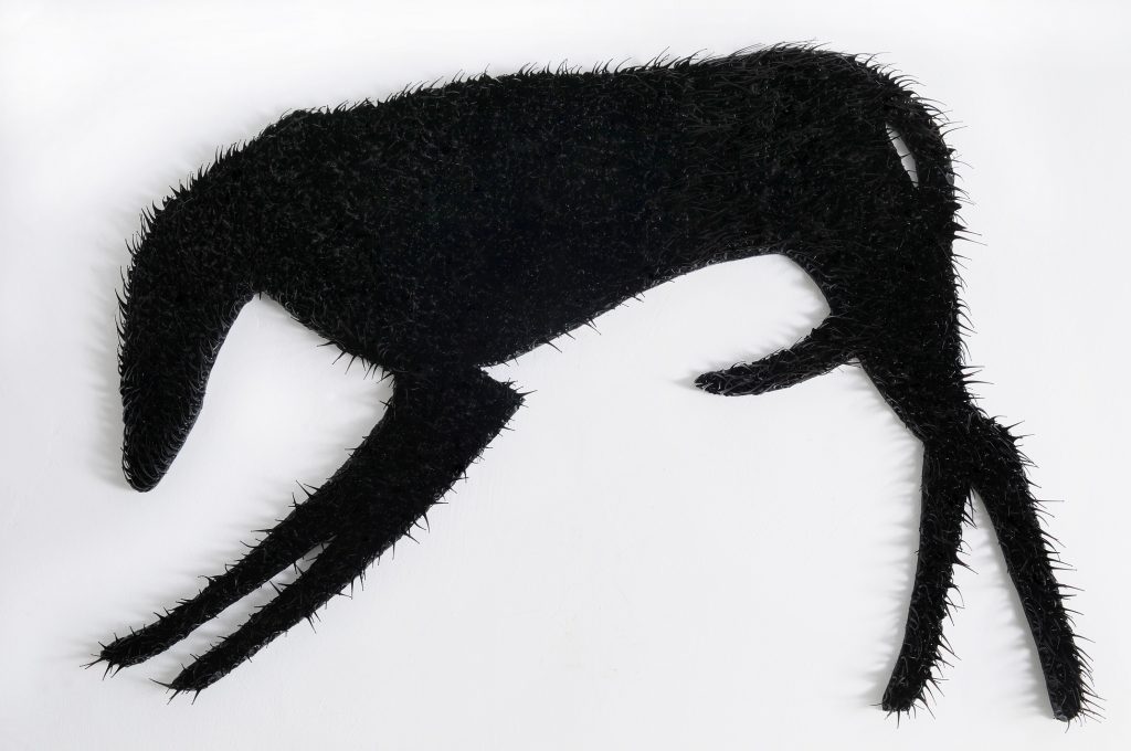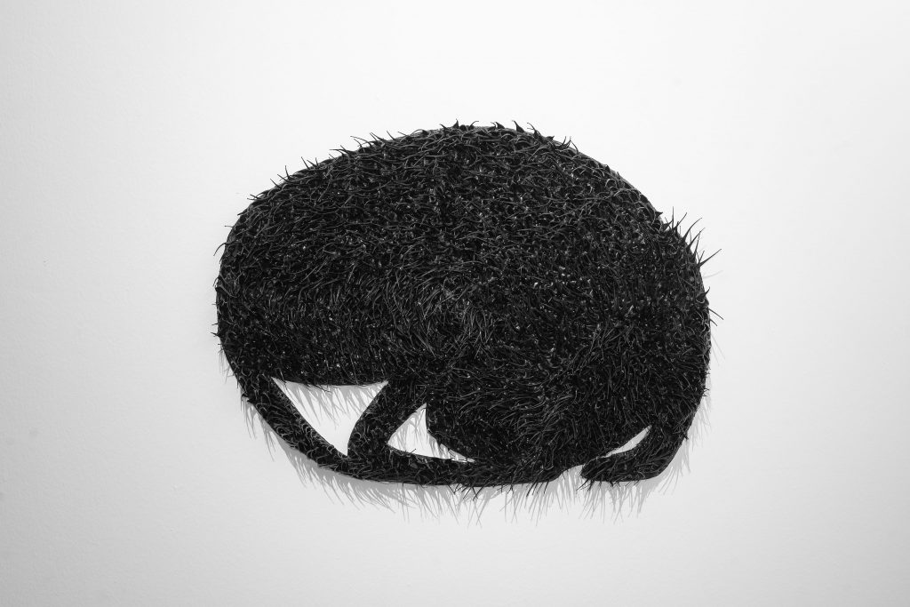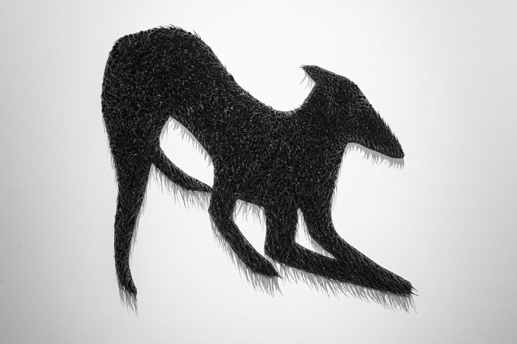 "Now this is the Law of the Jungle – as old and as true as the sky; / And the Wolf that shall keep it may prosper, but the Wolf that shall break it must die. [. . .] / For the strength of the Pack is the Wolf, and the strength of the Wolf is the Pack". from Kipling, The Law of the Jungle , “How Fear Came,” The Second Jungle Book, 1895) The first animals to break through Disney’s Jungle Book and enter the exhibition are Dafna Kaffeman’s wolves, affixed to the wall and hovering somewhere between two-dimensional depictions and three-dimensional sculptures, between realism and imagination. Wolves are social animals whose way of life is based on cohesion and a balance of power. Despite the fierce strength that may come to mind when we think of them, Kaffeman has used a quintessentially fragile material: glass. But instead of being clear, this glass is black, and the wolves’ fur is dense, prickly–and yet crushed. Separated from the pack, each animal is locked in position against the stark wall. It is somehow pitiful to see the wolves thus, frozen mid-movement, unable to shatter the confines of their material and rejoin the the roaming band and open spaces. Talia Amar, Curator
